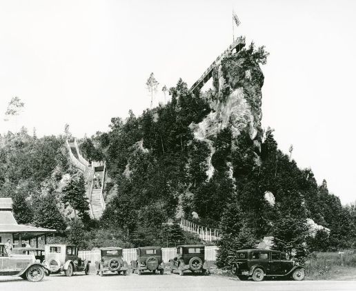 Castle Rock had been an ancient lookout of the Ojibway tribe, who often called it “Pontiac’s Lookout.” A company named Norton and Lund purchased the site around 1927. Norton and Lund built a stairway to the top of the Rock, opened a souvenir stand and made cabins available for tourists.