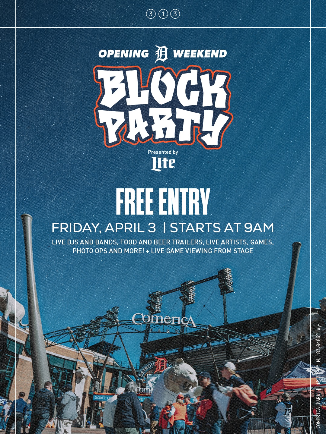 If you’re not lucky enough to have tickets to the sold out home opener, a highlight will be the Opening Day Block Party that takes over Witherell Street alongside Comerica Park with music, entertainment, and fan activations with appearances from PAWS and Rally Cats.