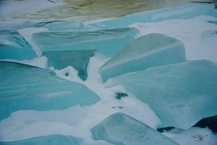 Blue ice occurs when weather conditions — such as a lack of high winds — allow water to freeze slowly and evenly, resulting in ice composed of large crystals (unlike snow, which is formed quickly and made up of small crystals).When light hits these big ice crystals, it can travel deep into the structures (compare this to snow, wherein light hits a sharp edge and reflects off of it right away, resulting in blinding white). When the light travels deeper into slowly formed ice, some of the red wavelengths of sunlight — which is the longest wavelength of visible light — get absorbed into the ice structure.