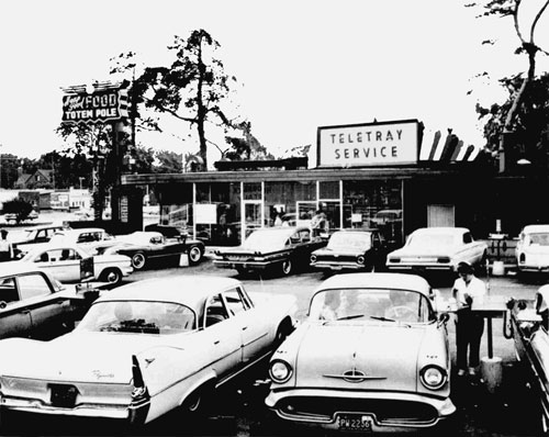 The Totem Pole (right) was the cruisers’ unofficial starting point on Woodward Avenue at Lafayette Street, kitty-corner from the zoo. This 1957 photograph demonstrates the “proper” way cruisers parked—to see and be seen, backed in, like the finned Plymouth in the lower-left corner. (click photo for larger view!)