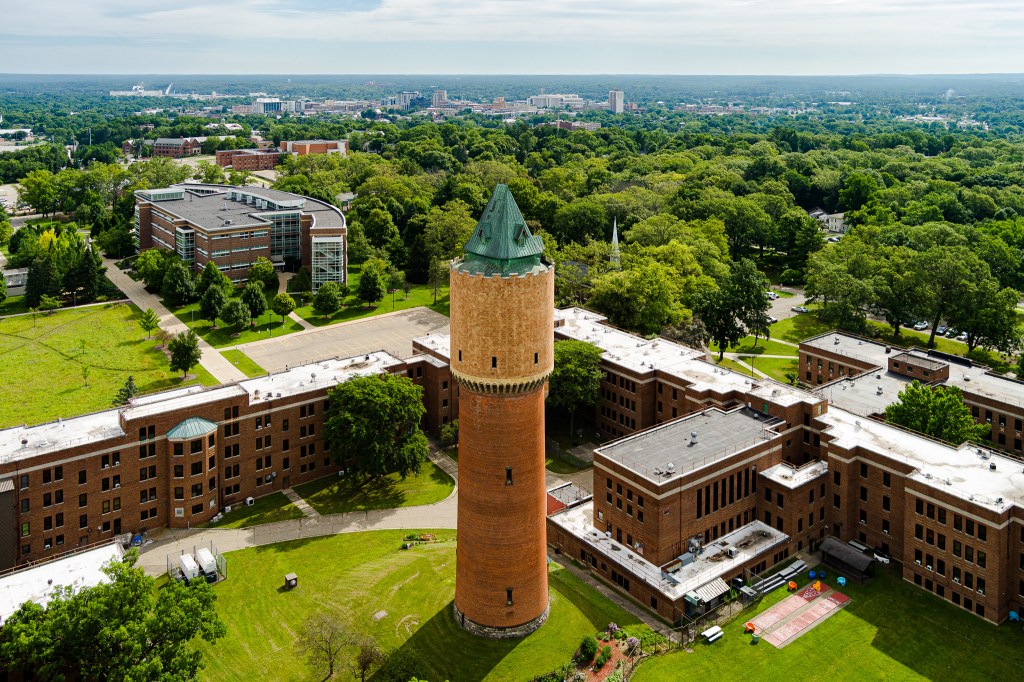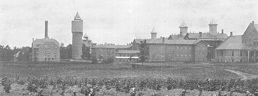 The tower soars 175 feet into the air, rising from a base of cut stone blocks five feet high. The brick begins above this base. Approximately 50 feet wide at its widest point, it contains three water storage tanks inside. The main tank is 40 feet high and 40 feet in diameter and has a capacity to hold more than 200,000 gallons of hard water … The structure is really a tower within a tower. The outer shell tapers from six feet thick at the base to four feet at the top. Enclosed is an inner shell, which is also about six feet thick. Between the inner and outer shells is a wooden circular stairway, which winds upwards until it reaches 100 feet. Then a series of ladders leads to the top of the tower. At the top is a little room, gothic in appearance, that has a window facing in each direction. Four enormous wooden beams meet in the center of the room. They are etched with dozens of sets of initials carved by visitors, the oldest by one W. E. DeLong dated 1898.