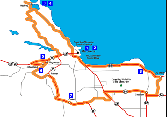 From Big Bay, head back on County Road 510 through the Huron Mountains and trees that arch over the roadway to form a tunnel of color. At US-41 head right and south into Negaunee (Chippewa word for pioneer) where you can visit the Michigan Iron Industry Museum, site of the first iron forge in the Lake Superior region. Negaunee’s Union Station Depot looks like a neat place to stay.  From Negaunee, continue to Ishpeming, home of the U.S. National Ski & Snowboarding Hall of Fame and the Cliff’s Shaft Mine Museum.