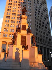 At the top of this 1871 monument to Civil War veterans is “a colossal personification of Michigan as a semi-civilized Indian queen menacingly brandishing a sword with her right hand and clutching a shield with the left.” (From an 1870’s Michigan History.) …