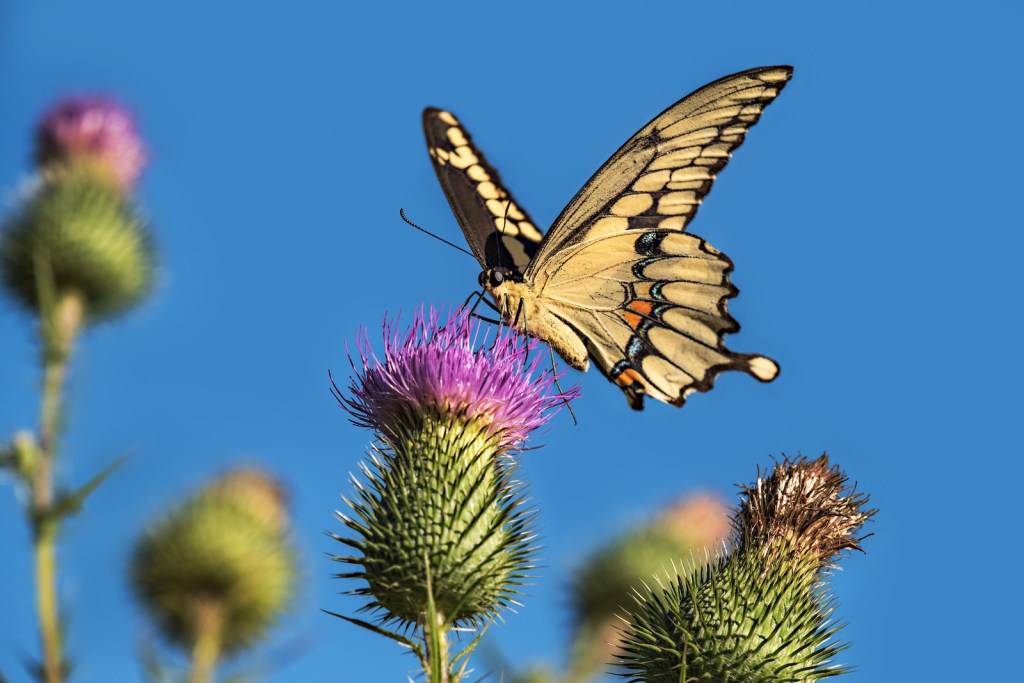 The aptly named giant swallowtail is the biggest butterfly in Michigan. Form your two index fingers into pointers and touch them to each other: if you take a large glove size, the butterfly’s maximum wingspan is approximately the length of both fingers put together. The field guides say around six inches.