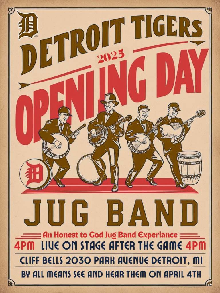 I’ve rounded up some of the highlights with a laser focus on FREE including and Opening Day party at Grand Circus Park by the City of Detroit and a Wisconsin manufacturer of watery beer that features a LOT of great food trucks, DJ Invisible, and lots of video walls and screens. There’s another free party from noon – 6pm just across Woodward at one of my favorite venues, The Fillmore with giveaways, WRIF and the game on their MASSIVE screen (tell the security guys Andy sent you and they will laugh). Also on the free front are a party at Gilly’s with giveaways, raffle, face painting & DJ Ray Ya Dig (official DJ of the Lions) from 9 AM–4 PM. I think that the Opening Day Party with my friends The Honest to God Jug Band is free, but they’re so fun and Cliff’s Bells is SO cool that I think you won’t mind if there is a cover.