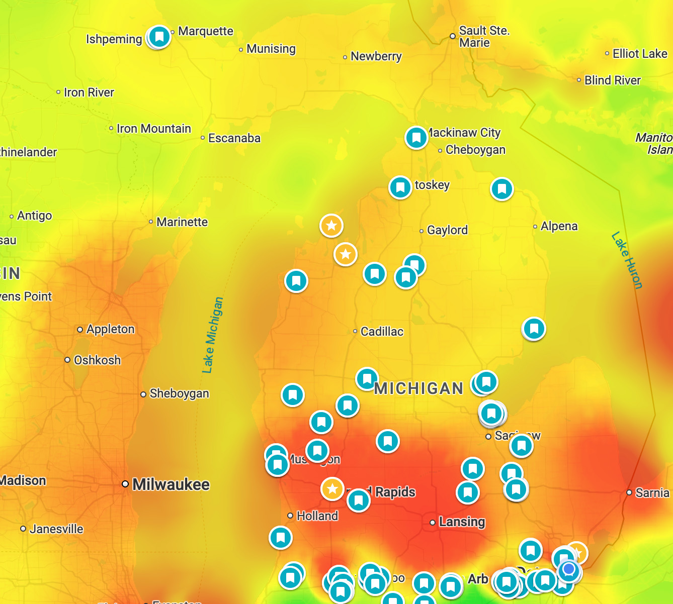 Yesterday morning the Mackinac Bridge Cam captured smoke so dense that it looked like the bridge was shrouded in fog! There’s less today but it’s still an astonishing amount of smoke so be sure to keep an eye on your local air quality because as the map shows, it’s not great right now!