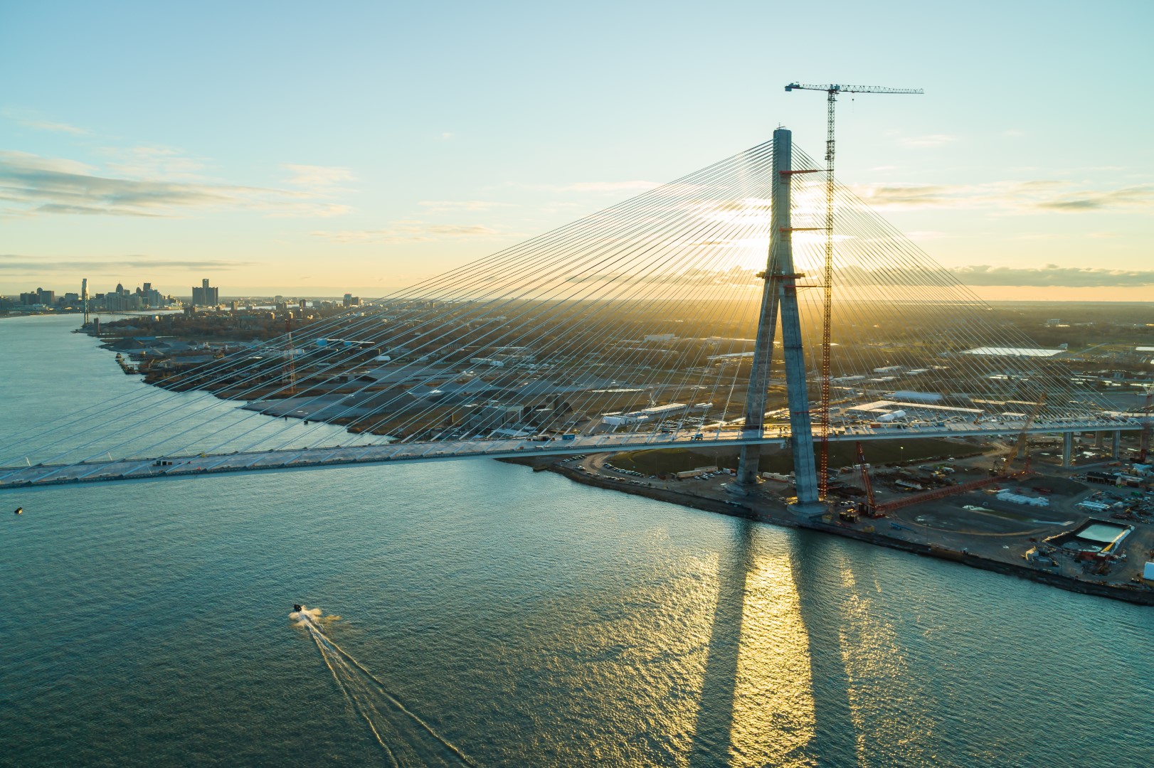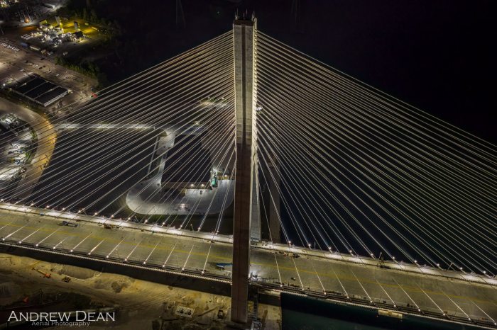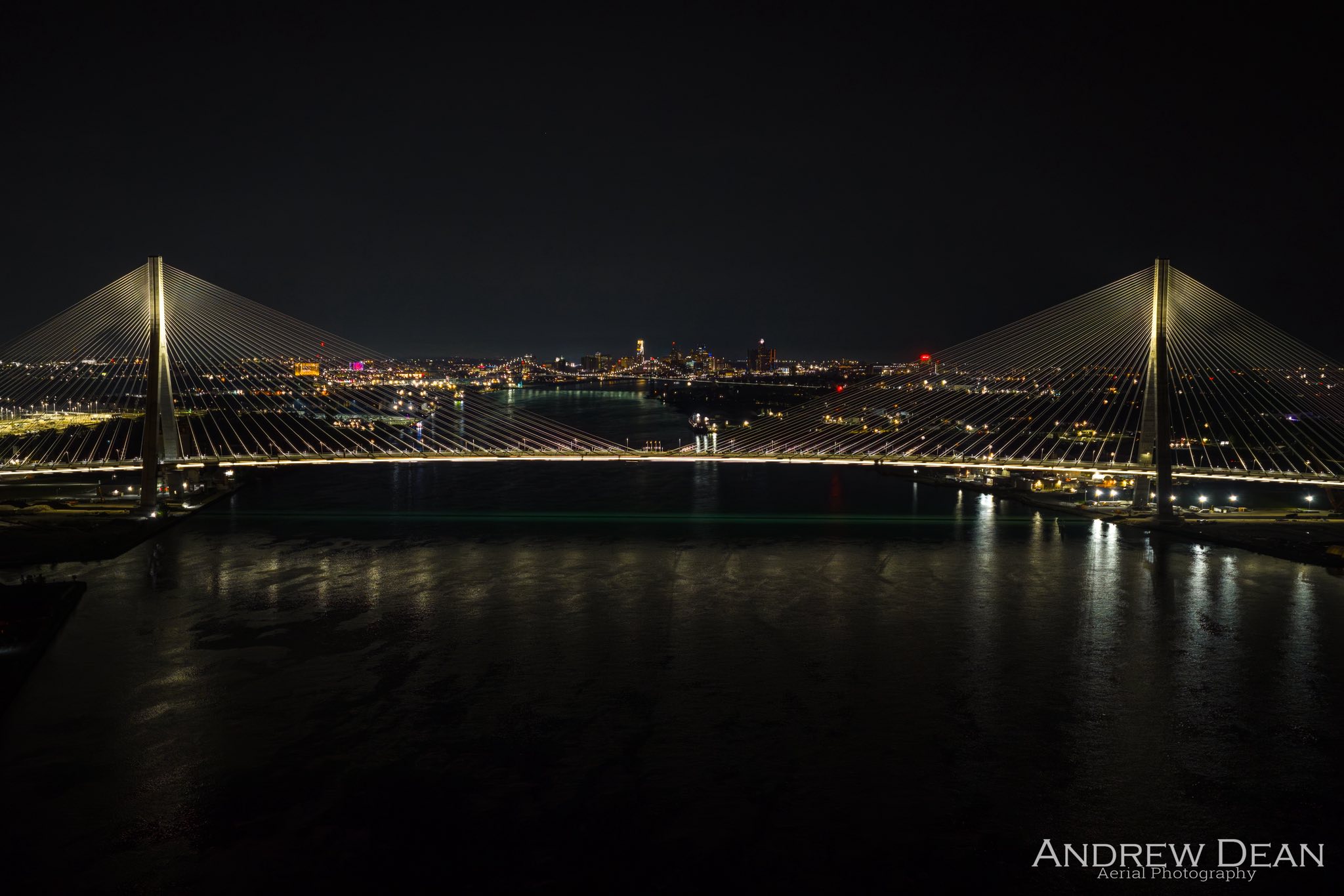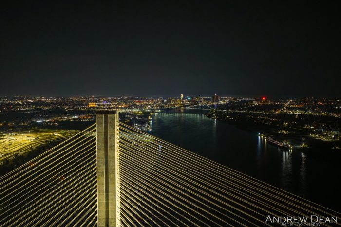 I heard rumors yesterday that were confirmed when I woke up this morning to Andrew’s eye-popping shots of the Gordie Howe International Bridge from Detroit to Canada all lit up! Andrew shares that this isn’t the final stage either. According to the Gordie Howe social media pages – the bridge will have 5,000 aesthetic lights that will illuminate the cables, towers, deck and approaches!! I’ve also got a flyover video from the Gordie Howe International Bridge below.