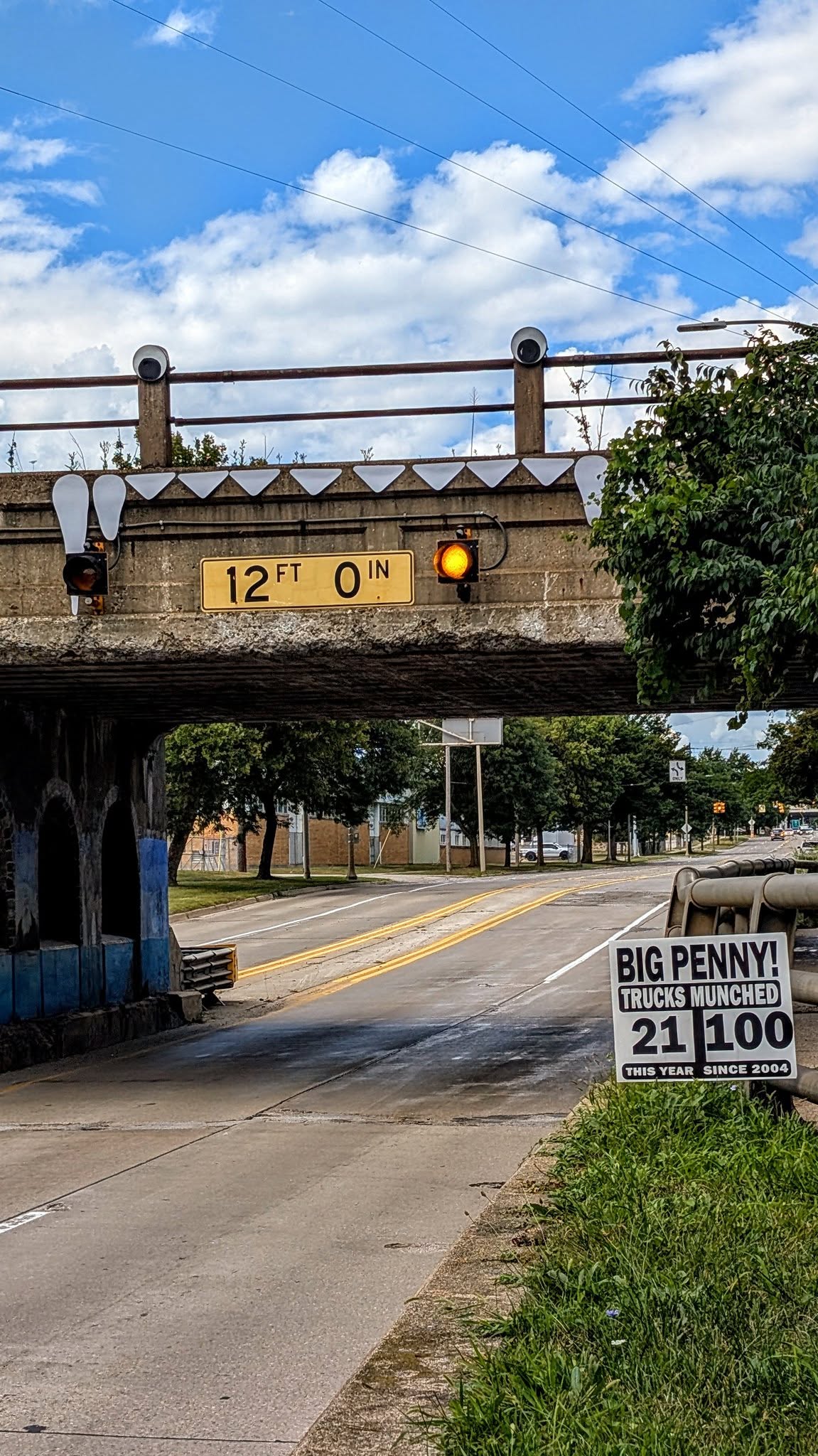 Back in May, we introduced you to Big Penny, Lansing’s Truck Munching Bridge & now she’s back to show the Mighty Mac it’s not the only bridge making news. This diminutive 12-foot tall bridge has taken some big bites over the years – so many that as of May 1, 2025 she had snacked on 87 semis since counting began in 2004. Despite the added exposure Penny has been on an absolute tear in 2025, and yesterday our friends at STUPID Lansing threw a party celebrating the 100th truck munched! WLNS Lansing was there to document this historic occasion, and you can head over to STUPID – Lansing for more on this important story & some great Big Penny merch!