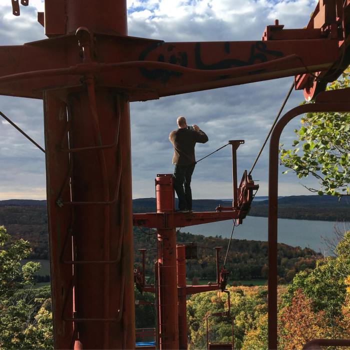Most of the photos on Michigan in Pictures are someone else’s, but every once in a while, I’ll sprinkle in one of mine. I took this several years ago at Sugar Loaf Mountain Resort on the Leelanau Peninsula. The guy’s wife told me that he works on the really tall power lines and (clearly) has absolutely zero fear of heights.