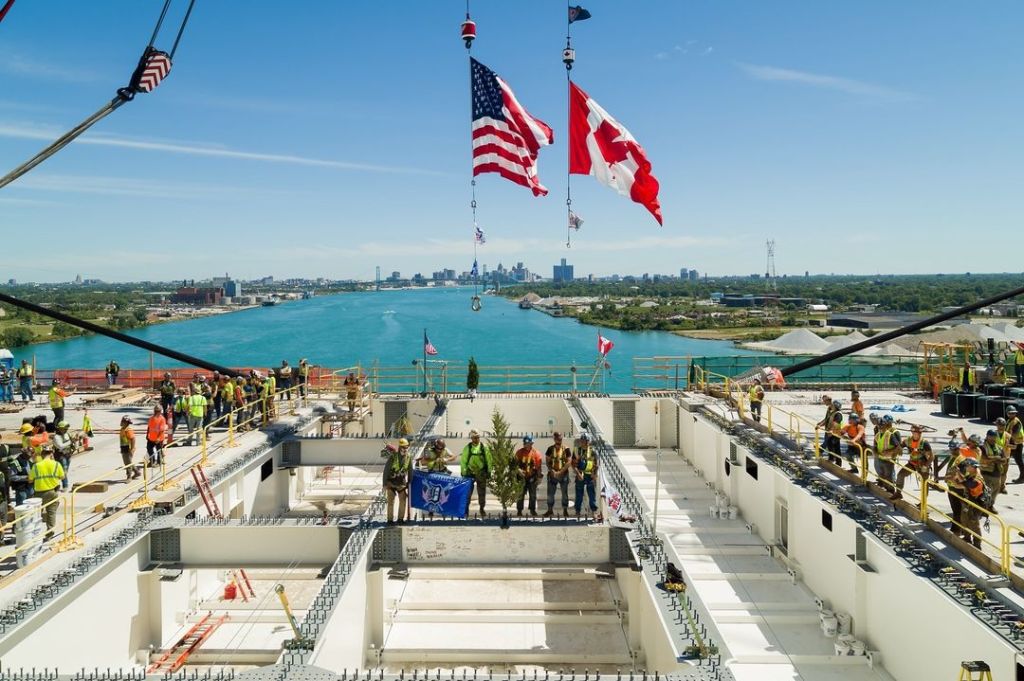 In June 2024 I shared photos of the US & Canadian crews “topping out” the Gordie Howe International Bridge. Topping Out is a special ceremony dating back over a thousand years that symbolizes connection. Ironworkers say the evergreen tree signifies a job well done & believe the custom brings good luck.