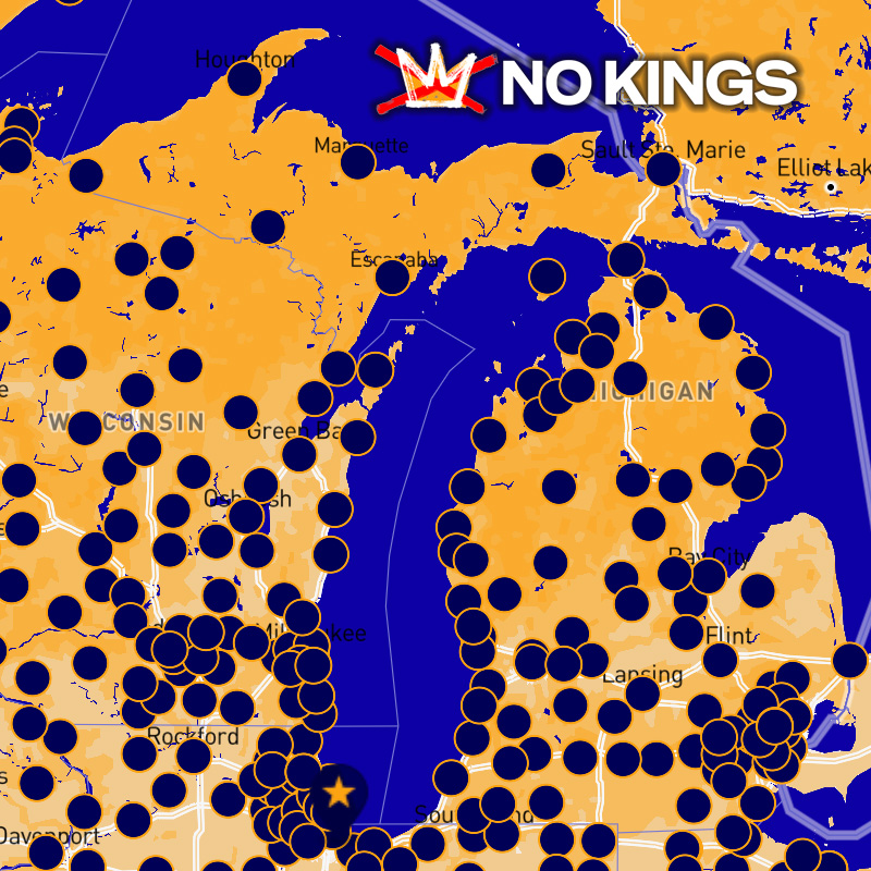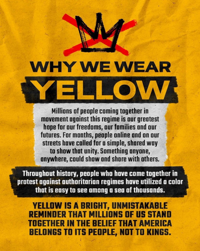 The second No Kings Day protests are scheduled across the state, nation, and even the world for this Saturday, October 18, 2025. You can check the map at NoKings.org or text #63033 for detailed information about protests near you. Also, they are asking that folks wear YELLOW because it is neither blue nor red