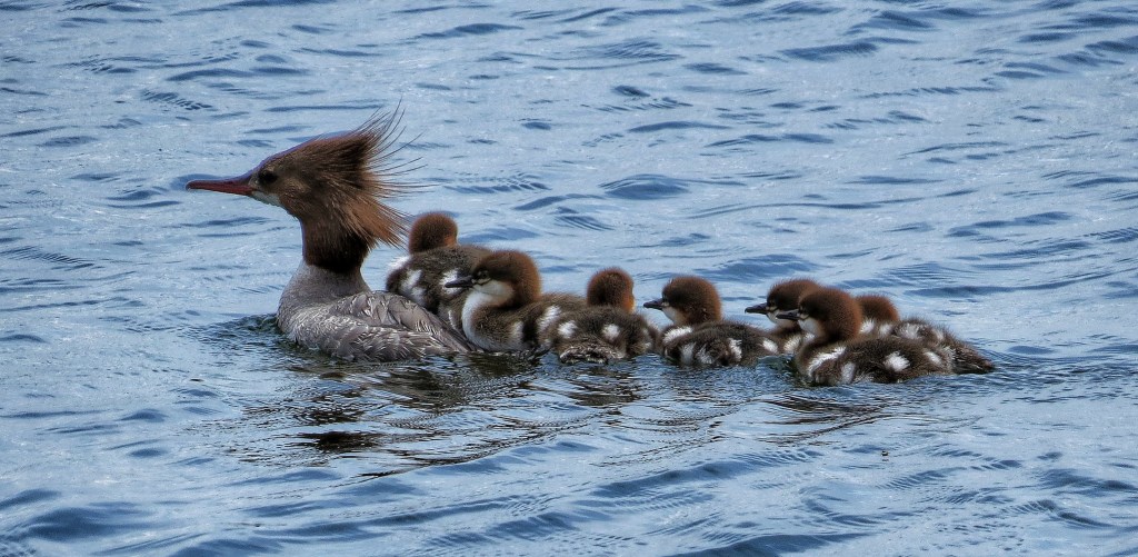 All About Birds says that Common Merganser are large, long-bodied ducks with thin, pointed wings. Their bills are straight and narrow, unlike the wide, flat bill of a “typical” duck, and the females have shaggy crests on the backs of their heads. Although these ducks look pretty punk & cool, the Tip of the Mitt Watershed Council reminds us that Merganser ducks are the main culprit in the spread of swimmers itch: