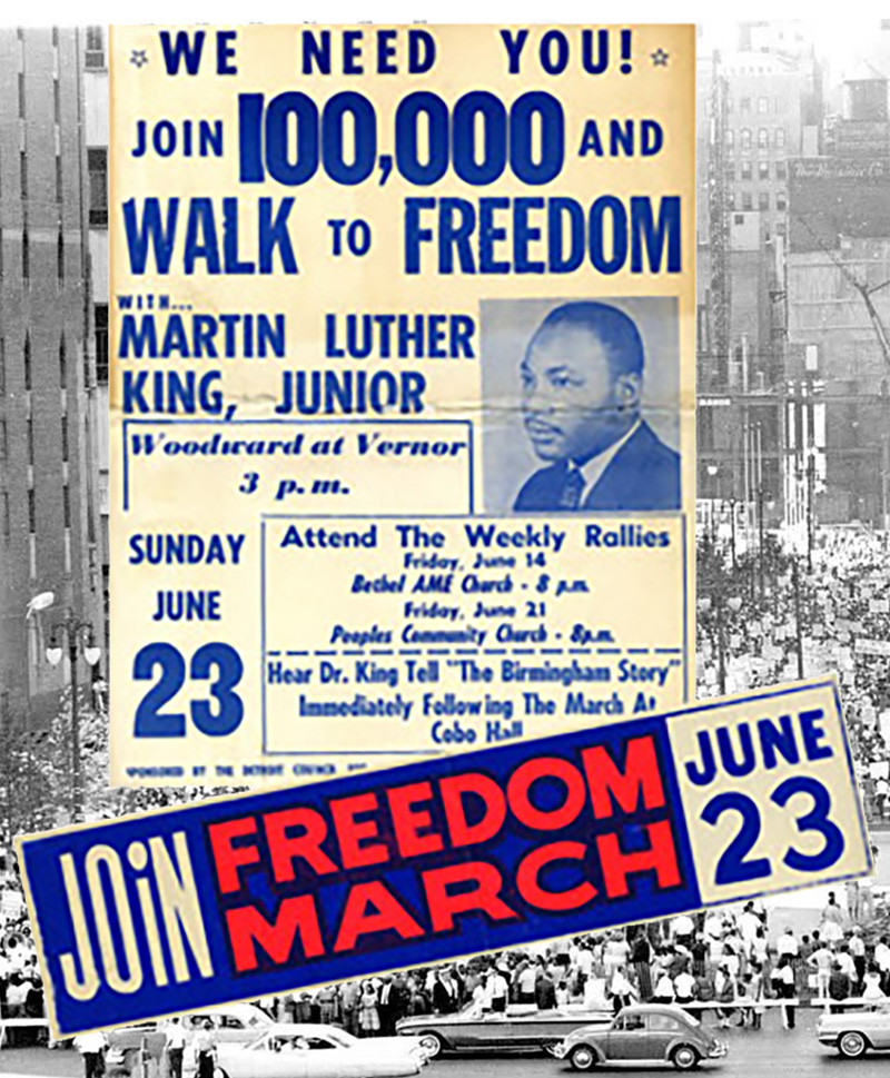 Dr. King led the march and shed light on the status of African Americans in northern industrial cities. Organized by the Detroit Council on Human Rights (DCHR), the Walk to Freedom was the largest civil rights demonstration in the nation’s history. Its purpose was to speak out against segregation and the brutality that met civil rights activists in the South while at the same time addressing concerns of African Americans in the urban North: inequality in hiring practices, wages, education, and housing. The date of the march, June 23, 1963, was chosen to commemorate the 20th anniversary of the 1943 Detroit Riots in which 34 people, the majority of them African American, were killed.