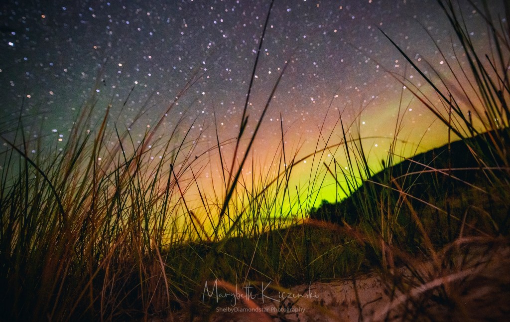 This is one of many photos in MaryBeth’s Labor Day Aurora Show gallery. She shares that this was in 2019 when G1 and G2 level geomagnetic storms triggered all kinds of activity. Due to weather, she started her chase in Sleeping Bear Dunes National Lakeshore (where she took this photo), but due to weather, she packed up and decided to head another 6 hours north to Pictured Rocks National Lakeshore.