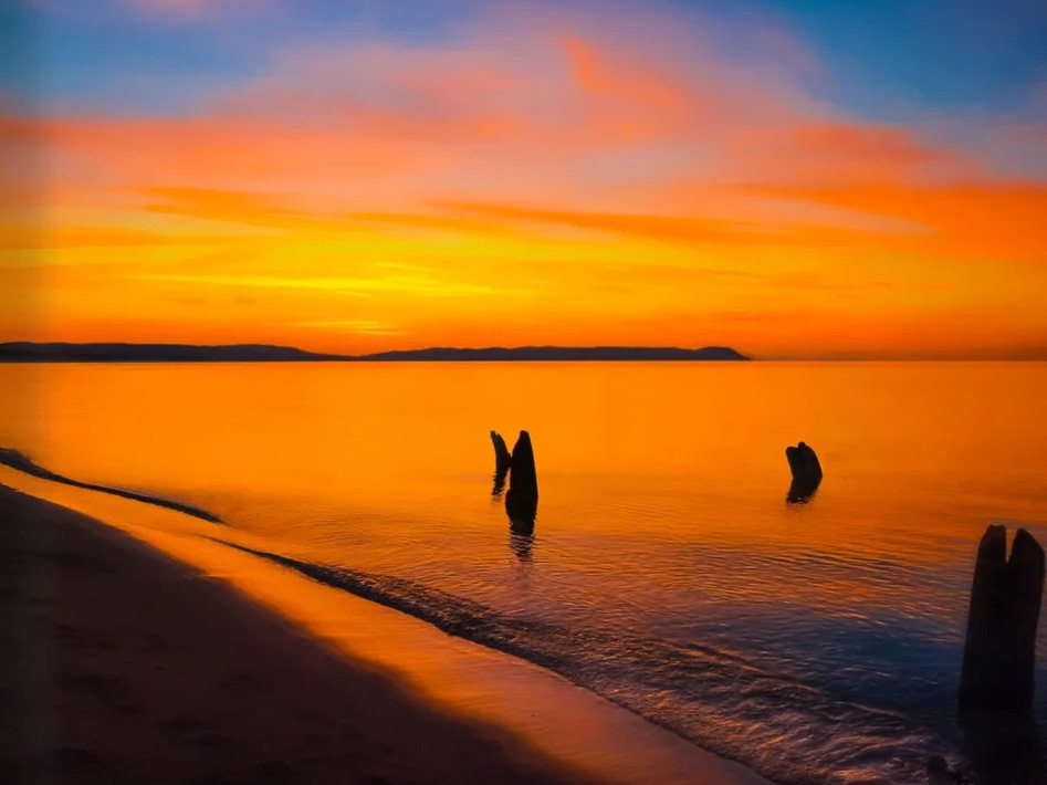 The sun’s brush paints the day’s end with strokes of flowing orange and opalescent coral. Sleeping Bear Dunes, guardian of the coast, stand silhouetted against the celestial masterpiece. As the sun descends, the waters of North Bar Lake become a mirror, reflecting the heavens in all their fiery glory. A ribbon of liquid cuts through the sand, mirroring the sky’s vibrant hues. The wet sand, kissed by the setting sun, flows with ethereal light, a testament to the sun’s final performance. The air, still and hushed, is filled with the gentle lapping of waves against the shore, a soothing melody that accompanies the visual symphony.