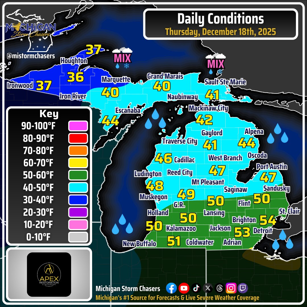 The folks at Michigan Storm Chasers share a detailed statewide Michigan weather forecast every morning that you should definitely incorporate into your daily feed. On Facebook they share that although we will see temps above freezing for most of the state, even topping 50 degrees in southern Michigan, temps will drop later in the day, potentially precipitously in what is known as a “flash freeze”. A flash freeze happens when rain has fallen, completely stopped, and then shortly afterward air temperatures drop from the 40s or 50s down into the 20s or colder. Ryan explains is all in their excellent video.