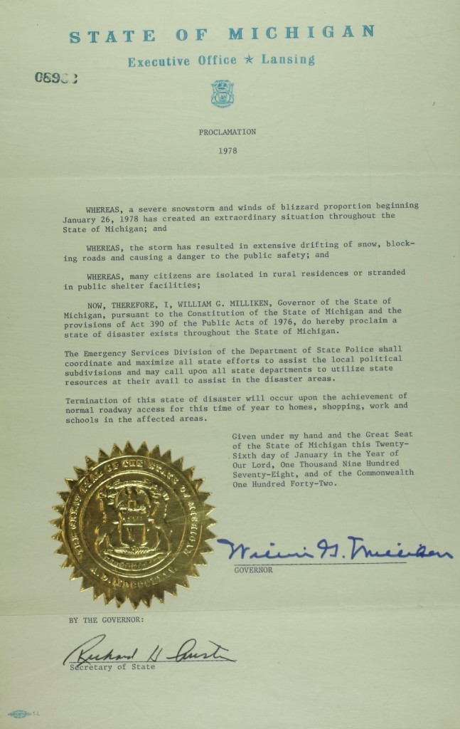 On January 26-27, 1978, snowstorms with fifty-to-seventy-mile per hour winds pummeled much of Michigan. Snowfall totals ranged from eighteen inches in Lansing to an incredible fifty-one inches in Traverse City. More than 100,000 cars were abandoned on roads and highways, and travel was impossible for days. Governor William G. Milliken declared a state of emergency on January 26 (See the image below.) and activated the National Guard to assist with the cleanup. The governor also requested financial assistance from the federal government and estimated damage totals to be more than $25 million, not including lost productivity from workers who were unable to get to their jobs.